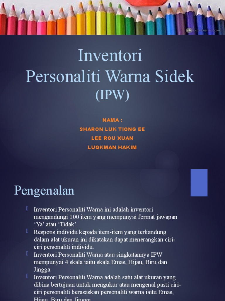 Inventori personaliti warna ipw merupakan pengubahsuaian berasaskan teori personaliti warna yang diperkenalkan don lowry. Inventori Personaliti Warna adalah satu alat ukuran yang dibina bertujuan untuk mengukur atau mengenal pasti ciri-ciri personaliti berasaskan personaliti warna iaitu Emas Hijau Biru dan Jingga. 54 views 4 likes 1 loves 0 comments 2 shares Facebook Watch Videos from Kaunselor KITA.