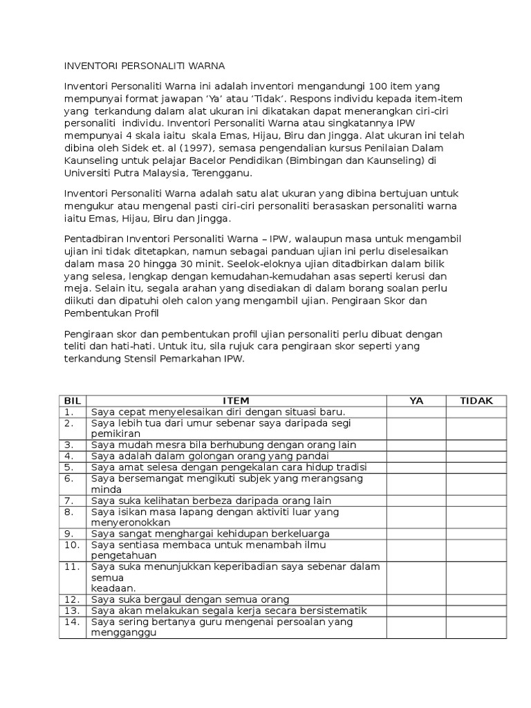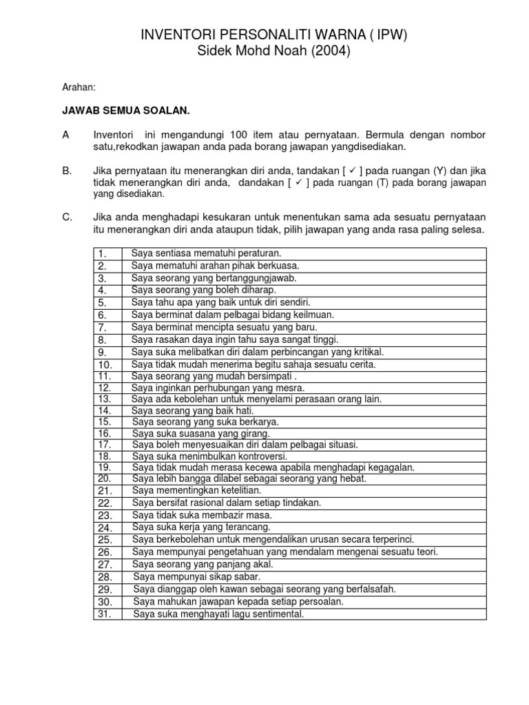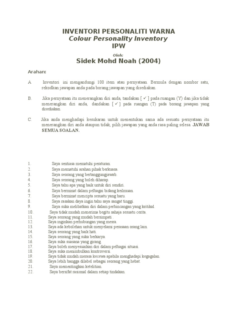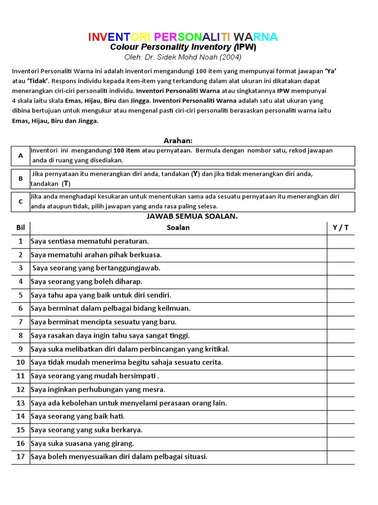 . Sidek Mohd Noah dan pelajar Sarjana Pendidikan Bimbingan Kaunseling Universiti Putra Malaysia Terengganu UPMT. INVENTORI PERSONALITI WARNA IPW merupakan pengubahsuaian berasaskan teori personaliti warna yang diperkenalkan Don Lowry melalui kad-kad aktiviti true colours. Jika pernyataan itu menerangkan diri anda tandakan pada ruangan Y dan jika tidak menerangkan diri anda.
